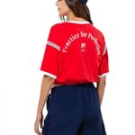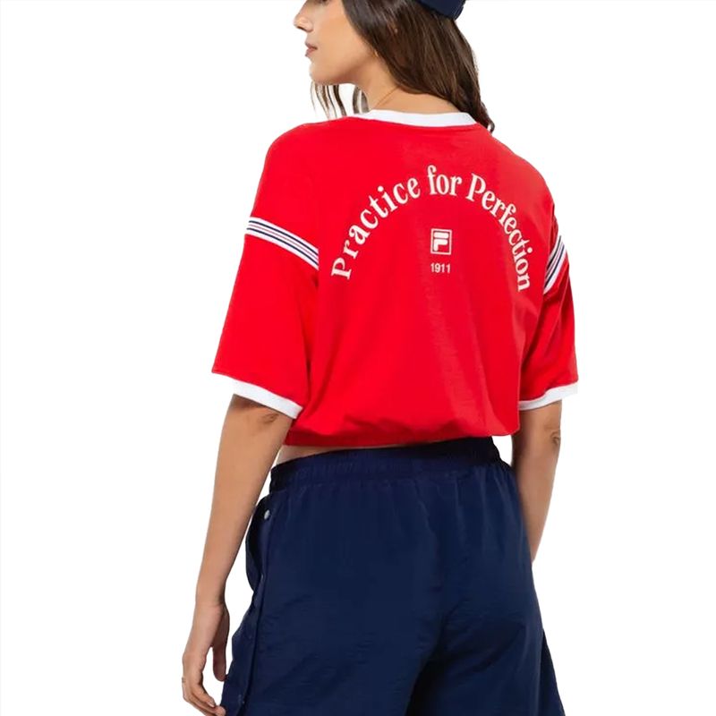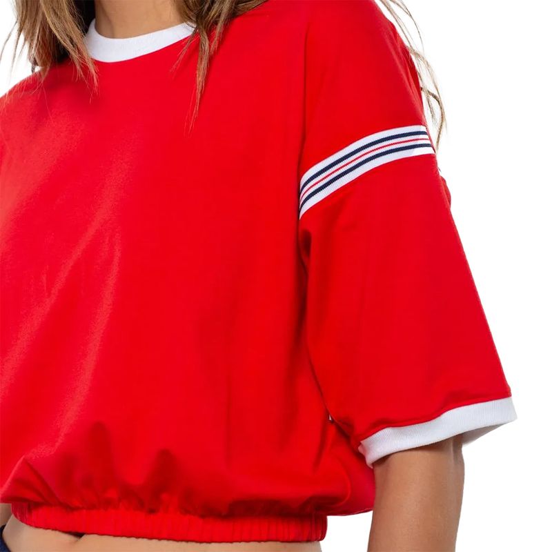 Esta remera femenina combina un diseño moderno y una producción responsable. Confeccionada en tejido de algodón y elastano con certificación BCI, garantiza suavidad y alta transpirabilidad gracias a su acabado especial. Su corte recortado, con puños y cintura acanalados, ofrece un estilo actual.